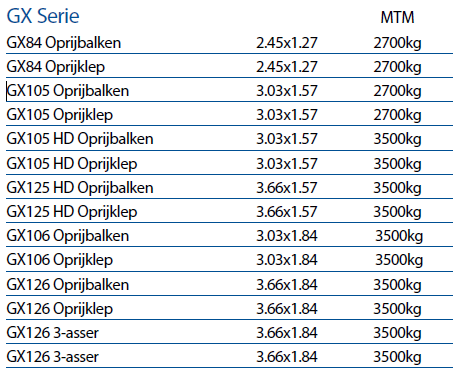 De GX serie bestaat uit geplooide gegalvaniseerde stalensecties met gedichte zijkanten voor een grote flexibiliteit. De nieuwevormgeving zorgt ervoor dat de machinebestuurder veilig uit de cabine kanstappen. Je kan de keuze maken tussen een model met twee verstelbare (in debreedte) oprijplaten (geperforeerd staal) of een oprijklep uit 1 stuk. Er zijnverschillende modellen verkrijgbaar in de GX-serie, van de GX84 tot de grootsteGX126. Allen kunnen ze verder uitgebreid worden met opties zoals een ladderrekof draadzijden verhogingen (enkel mogelijk bij model met oprijklep uit 1 stuk),of een extra lange klep/oprijplaten (1,83 ipv 1,22m). De geïntegreerde steunvooraan voor de graafbak is standaard. De MTM is 2700 of 3500 kg. Ook bij de GXserie vinden we de geïntegreerde steunen aan de achterklep/oprijbalken terug. Dezestandaarduitrusting zorgt voor een goede ondersteuning tijdens het laden zondersteunpootjes te moeten uitzetten.